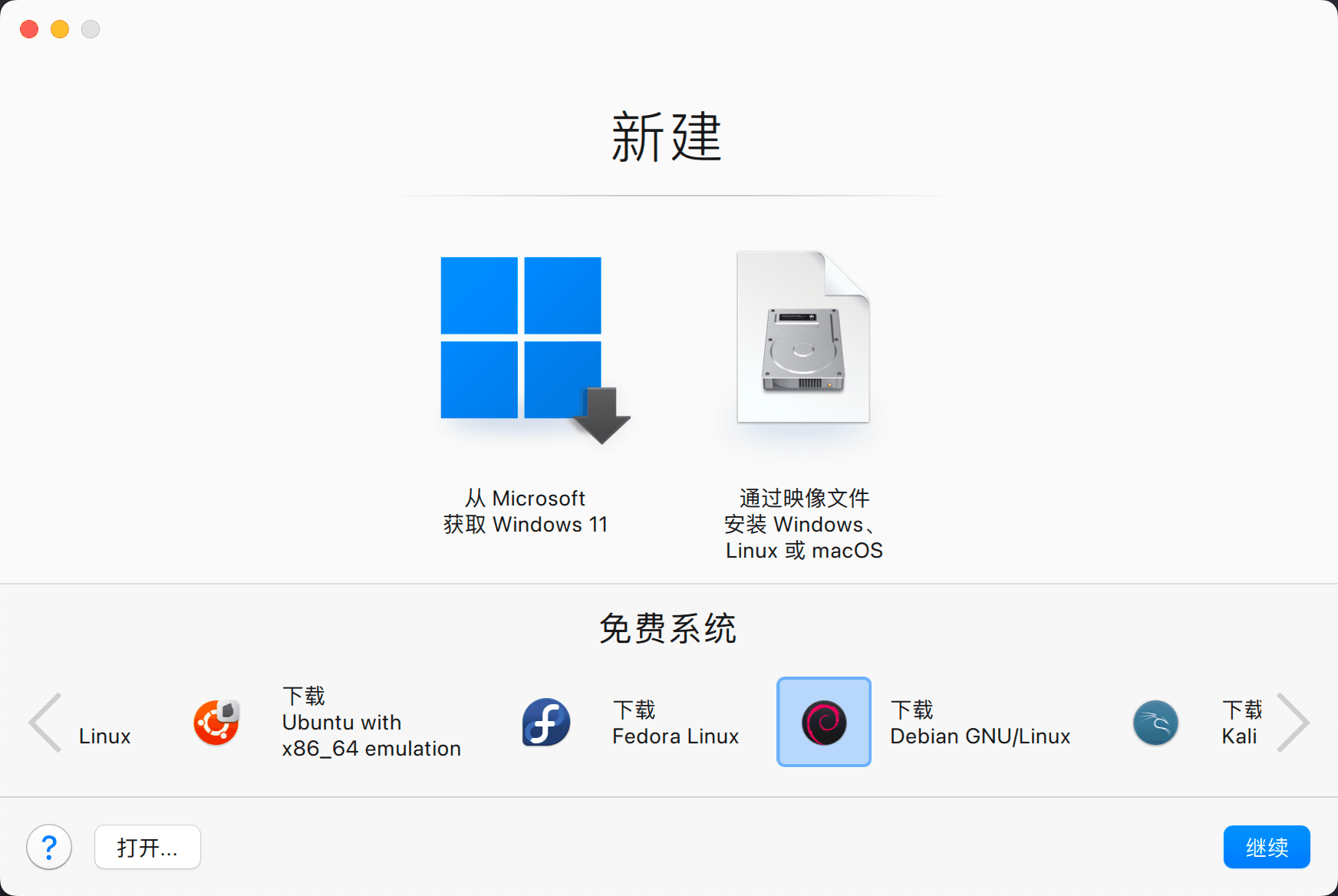 本人使用的mac电脑,因此用的Parallels Desktop(以下简称PD) 这个app,mac上非常好用的虚拟机软件。然后把公司的vpn安装到虚拟机里,因为这个虚拟机单纯的用于网络代理,我们尽可能降低其性能消耗,所以我选择了运行Debian操作系统(前提是你需要安装的VPN软件支持这个操作系统),在PD里,点击新建虚拟机时可以直接下载Debian的操作系统,并且把系统的性能限制到了1核CPU和1GB内存。