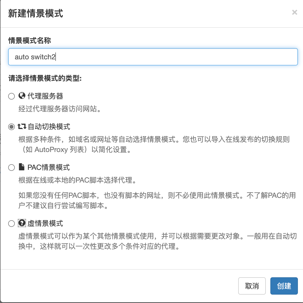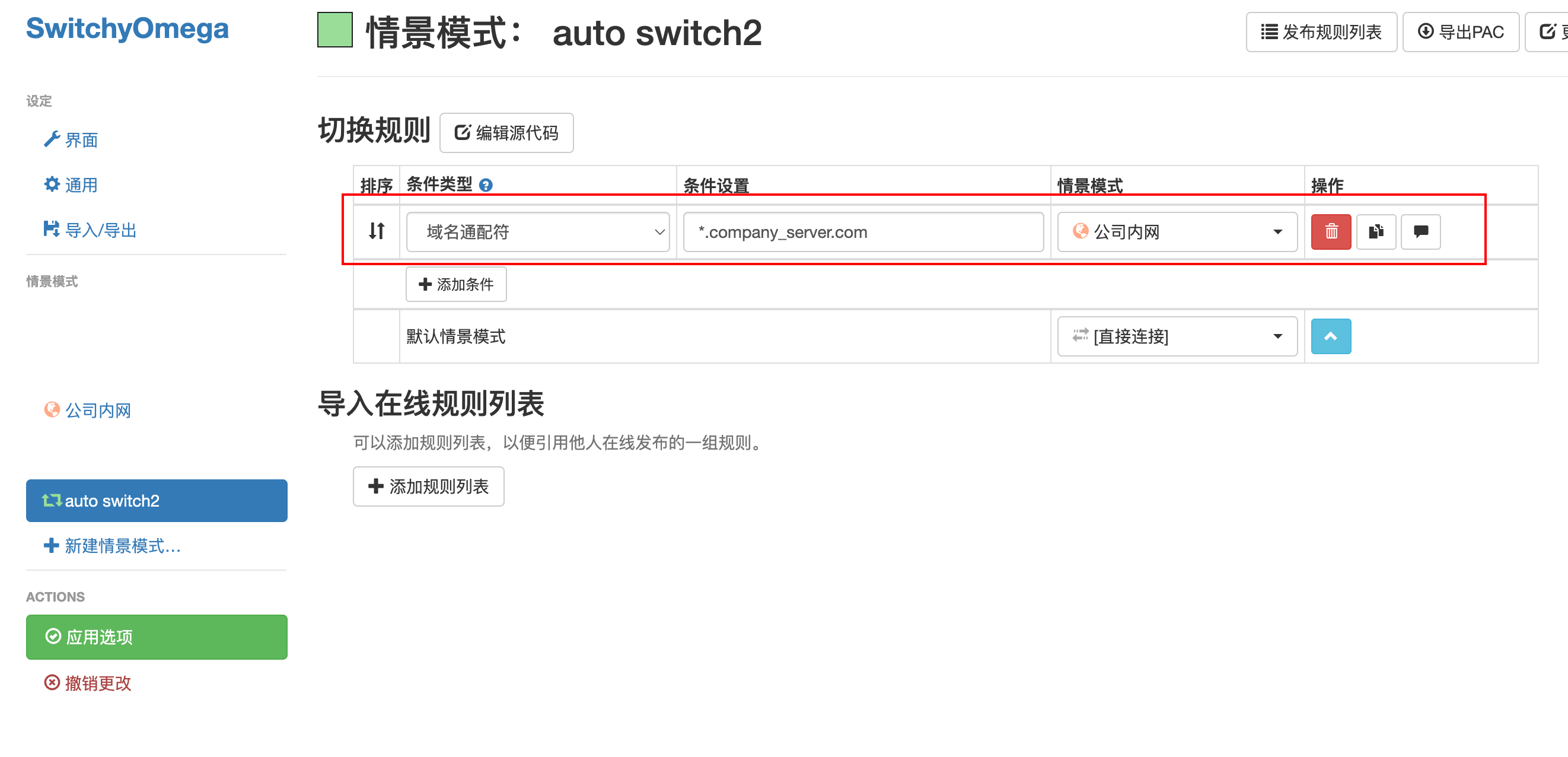 然后为了只让内网网页走代理,再创建一个自动切换代理的配置。保存配置后,点击插件图标,将代理代理模式切换到你创建的自动切换配置即可。