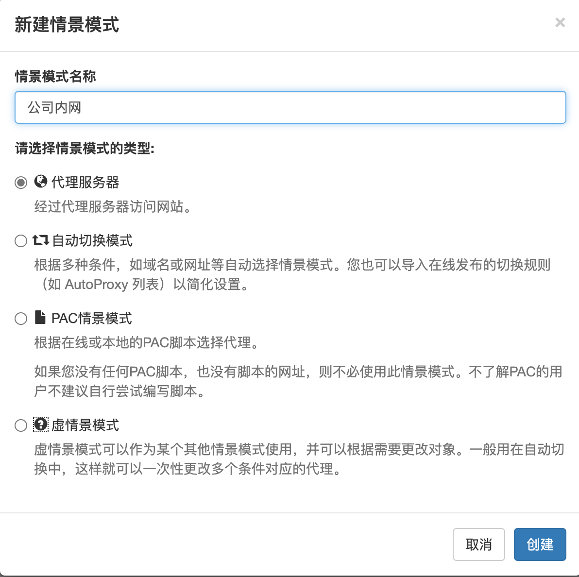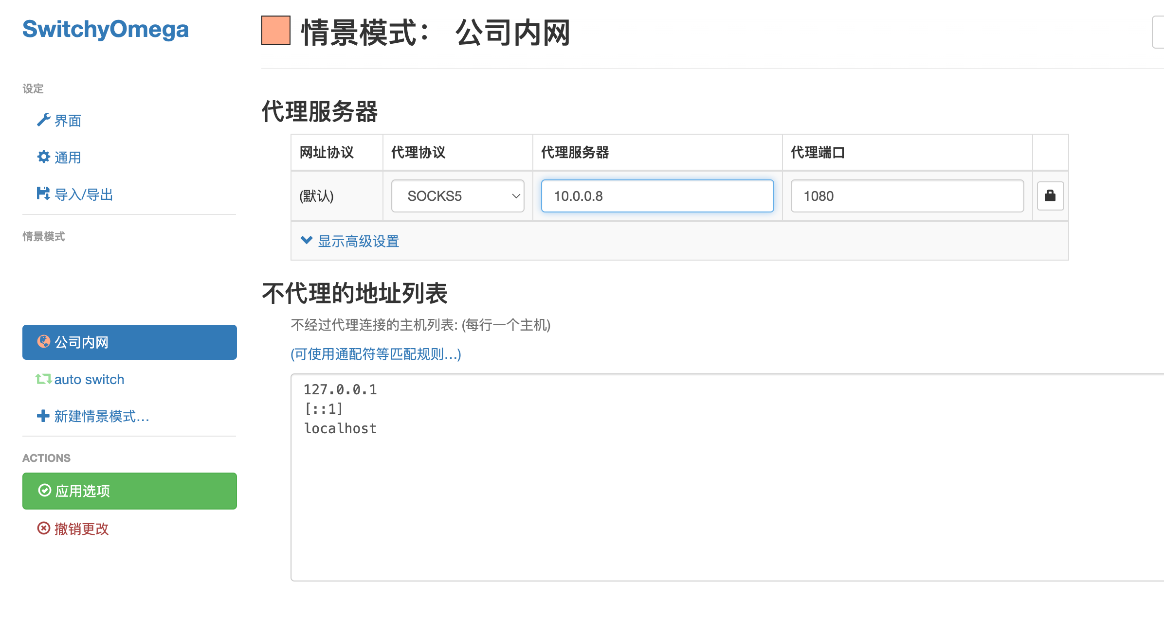 这是笔者使用的方法,我只希望当访问公司内网用到的几个特定网站时使用公司内网,其他的情况下依然走正常的网络。所以笔者使用了Proxy SwitchyOmega这个浏览器插件。 安装插件后,新建一个情景模式,配置socks代理